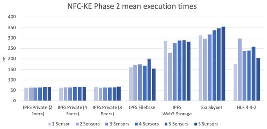 The second phase of the NFC-KE is, in terms of real-world impact, the most important since the corresponding execution times will directly influence the responsiveness of the system. Generally, Phase 2 is querying the file storage system for the given Sensor Node’s public key to verify the message signature, originating from said Sensor Node. Therefore, lower execution times will allow for faster message processing. A significant differentiation needs to be made between the two phases because Phase 1 must be executed only once for each Sensor Node, whereas Phase 2 is executed repeatedly afterward. Thus, the impact of particularly bad Phase 1 execution times is less significant than comparatively high execution times in Phase 2.