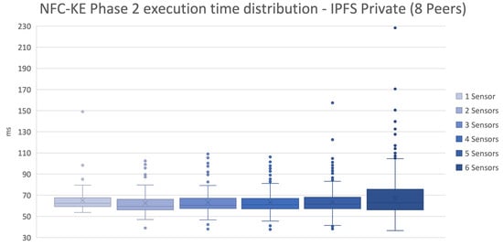 To get a deeper understanding of the Sensor Node number’s influences, Figure 6 shows the particular execution times of the IPFS private scenario using eight peers within the network.