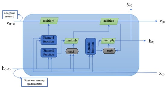 In the LSTM model, the cell state is the main chain for the forward data flow. Two steps must be updated: one is from the forget gate , which decides which information to keep or forget from . Data from and information from are moved through the values that yield a 0 or 1. Here, 1 represents keep, and 0 represents forget. The final result from the forget gate is multiplied by the old cell state Equations (1) and (2). The second is from the input gate and the candidate memory cell , which decides whether to add new information. In an input gate, a sigmoid layer determines whether a piece of new information should be added. In the candidate memory cell, the input from and the current input pass through a hyperbolic tangent function. The result from the input gate was multiplied by the values of the candidate memory cell. Finally, the two values from the first and second steps were added to update the cell state [].