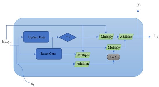 The third model, the GRU-based RNN, is similar to regular LSTM. As in the normal gate, three gates were used; the GRU has two gates, namely the “reset gate” and “update gate” [,]. Here, forgets the LSTM cell gate. It is a combination of the previous hidden state and current input and determines how much of the past information is neglected. A general representation of the GRU is shown in Figure 4. See Algorithm 3.