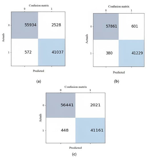 Seventy percent of the dataset was used for training, and thirty percent for the test set. Different evaluation methods are used in the experiments. Figure 6a–c shows the confusion matrices for the proposed LSTM, Bi-LSTM, and GRU models, respectively.