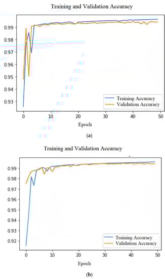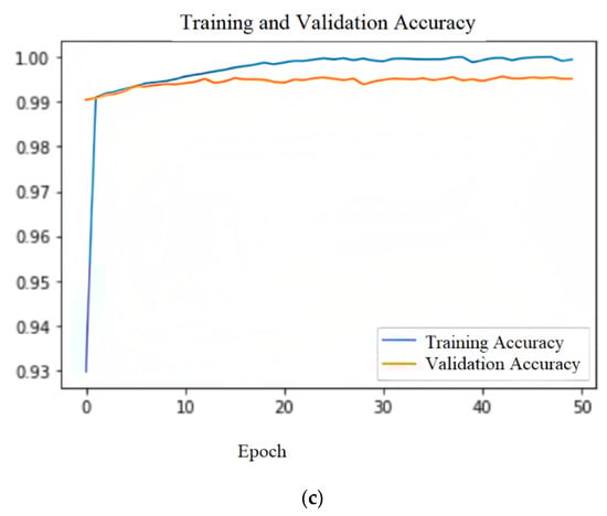 The blue curves in Figure 7a–c indicate the training accuracy and the orange curves describe the validation accuracy.