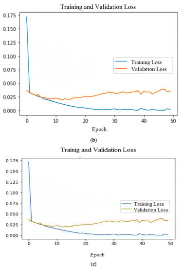 Figure 7a–c shows the training and validation accuracy of the proposed neural networks. The orange curve represents the validation accuracy, and the blue curve represents the training accuracy of the models. The training and validation loss of each proposed LSTM, Bi-LSTM, and GRU model are shown in Figure 7a–c, respectively.