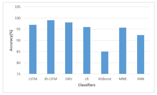 Figure 9 shows a comparison of the accuracy of the different algorithms, and Table 3 shows extended information about precision, recall, and F1 score. In this figure, we have compared the performance of other existing algorithms such as logistic regression (LR) [], XGBoost (XGB) [], multinomial naive Bayes (MNB) [,], and k-nearest neighbor (KNN) [,]. It can be observed from Table 3, that the accuracies obtained using LSTM, Bi-LSTM, GRU, LR, XGBoost, MNB, and KNN were 97%, 99%, 98%, 96%, 85%, 95.7%, and 92.4%, respectively.