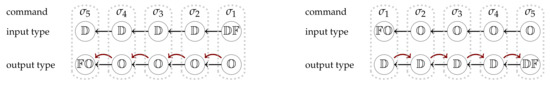 Proof. It is enough to show that is canonical. Since , it has at most one command on every node. It can only be non-canonical if there is a on a related node that cannot be connected to using an ≪-chain from the commands in M. This must be in A, which has a chain between and . If this chain goes in the direction , then by Proposition 9. Otherwise we know , and based on the remark above, is empty for all members of this chain and so are independent of B. This means the chain can be added to M, which is a contradiction. □