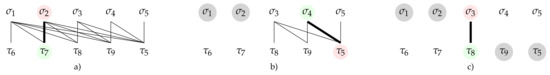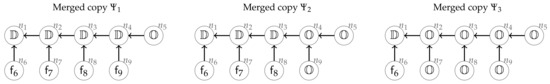 The input of the synchronization algorithm is , , which is a pair of refluent canonical command sets. The goal is to find, using successive conflict resolution steps, a merger command set M that fits Definition 6. In addition, we aim to show that our algorithm can produce any of the mergers allowed by the definition, and only valid mergers. To achieve this, the algorithm accepts a pre-set merger as an optional argument. Whenever the algorithm needs to make an otherwise arbitrary choice, is used to choose one of the possibilities. While choosing any of the possibilities will generate a valid merger, guiding the choice will guarantee that will be generated.