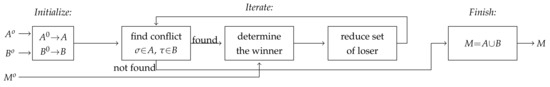 Conflict resolution: Out of and , choose the winner and the loser commands. If is given, let the winner be the one in . If is the winner, delete all commands from B which are in conflict with (including ). If is the winner, delete all commands from A which are in conflict with . Go back to Iterate.
