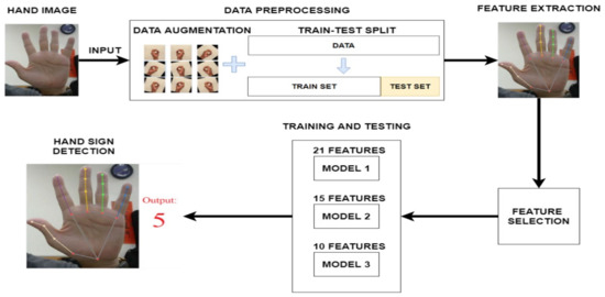 This section will explain the general design of how this research is conducted, as seen in Figure 1. The system will use an input in the form of a hand image from the dataset. The input will then be preprocessed. The data preprocessing step includes data cleaning to remove images that cannot be used, data augmentation to enrich the training and testing data, and splitting the data into the training and testing sets. The next step will be the feature extraction process using Mediapipe. Then feature selection using RFE will select the 15 and 10 most important features to detect ASL digit signs. Three models will be trained and tested using a different number of features, the original 21 features, 15 features, and 10 features. The output from the training will then be validated to assess the performance. The following sections will explain more in detail about the datasets used in this study and the process performed at every step.