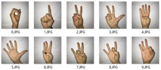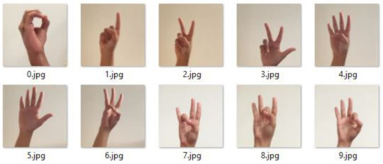 The first dataset consists of hand images for the hand signs 0–9 in American Sign Language (ASL). Each image has a dimension of 100 × 100 pixels. Each class has more than 200 images, comprising 2062 images in 10 categories. Images in this dataset have good quality and are all taken with a uniform white-grey background color. Figure 2 shows some example images from the dataset.