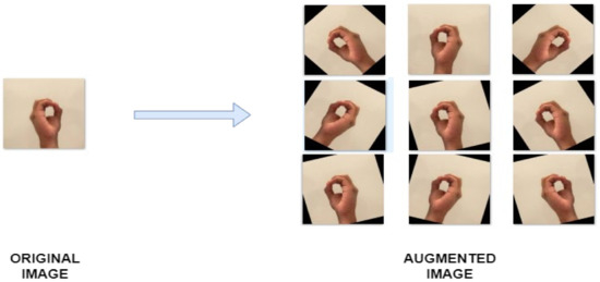 Image augmentation techniques are used for the first and third datasets to increase the variation and number of images in the dataset. Since the hand images are all right-hand, the image is flipped horizontally to obtain a left-hand image. The images will also undergo clockwise and counter-clockwise rotation to gain more variation in the hand position. Figure 4 below shows an example of the image augmentation.