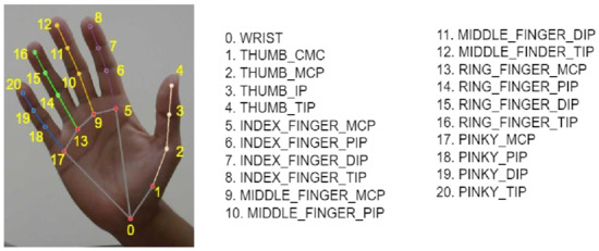 Mediapipe is utilized in this research to detect the hand landmark and obtain the landmark position from an image. Mediapipe can detect and extract 21 3D hand landmarks from a hand image. It can also detect left and right hands and supports multi-hand detection. Figure 5 shows how Mediapipe will detect a hand and the hand landmark coordinates. The output from Mediapipe is then stored as a Numpy file. This file will be loaded and used in the feature selection process, model training, testing, and validation.