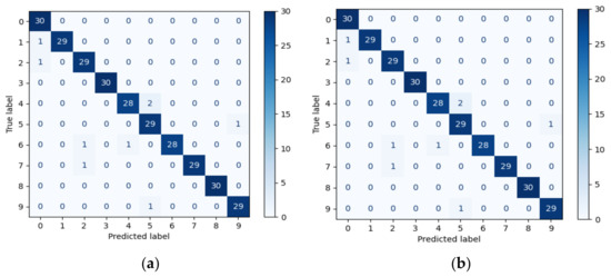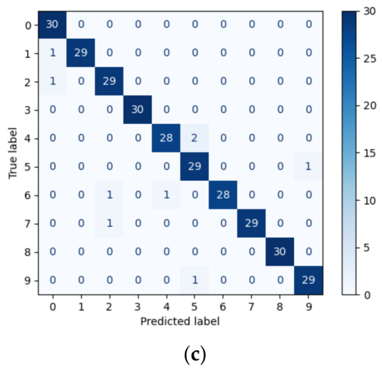 Figure 6 shows the confusion matrix for the models trained using ten features. For the model trained by Dataset 1, the most error in detection occurred on digit 7, which detects the hand sign as an 8. Furthermore, the validation result is very good for the model trained using Dataset 2. There is only a slight mistake when detecting some digit hand signs. The model trained using Dataset 3 has worse accuracy than the other two models. False detections mostly occurred on digits 0, 2, and 7.