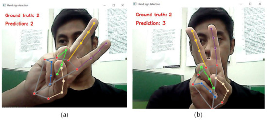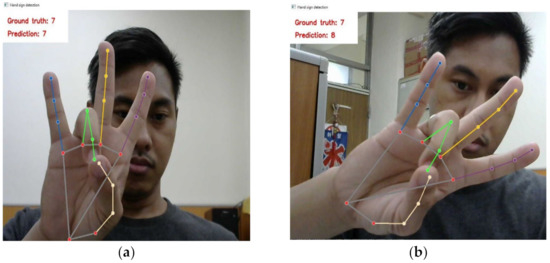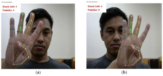 While it has not been investigated deeply yet, there are some suspicions on why the accuracy of the model trained using Dataset 3 has a very huge gap compared to Dataset 1, which also only provides hand images. This could be attributed to the huge number of images available in Dataset 3 compared to Dataset 1. These images are still being augmented for mirroring and also rotation, making the number of images in Dataset 3 even larger. This may cause Dataset 3 to have more images with wrongly detected hand landmark positions, as shown in Figure 11b. This means more noise is coming to the model during training that reduces the models’ accuracy.