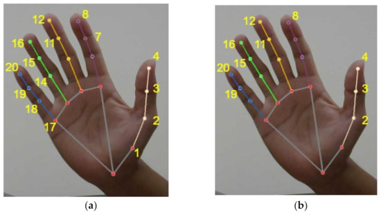 Detection and extraction of hand landmarks using Mediapipe. (a) Good result, (b) distorted result.