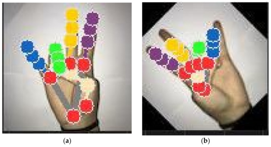 From the investigation, we found out that, in some cases, Mediapipe failed to detect the hand landmark position correctly when the images are augmented. Figure 11a shows a good detection result using Mediapipe, while Figure 11b shows a distorted landmark detection as an effect of image rotation.
