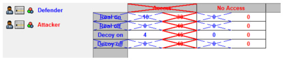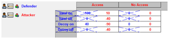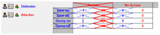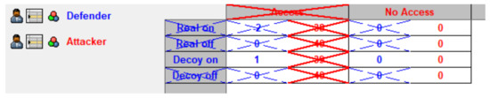 In order to reduce their costs for the network protection, the attacker’s actions a and defender’s actions d have opposite performance goals because the performance cost must increase for the attacker and decrease for the defender. The payoffs G for attacker and defender are and , resulting in a zero-sum game: