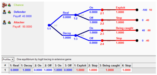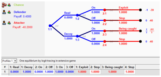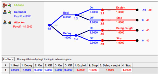Using the extensive (tree) game from Gambit v15.1.1, we introduced the values obtained in Figure 3, Figure 4, Figure 5 and Figure 6 and then calculated the Nash equilibrium and the results shown in Figure 7, Figure 8, Figure 9 and Figure 10 demonstrate that our proposed method had a great output for the defender. The honeypots decreased the attacker’s dominance and increased the chances that the defender would observe and stop their actions.