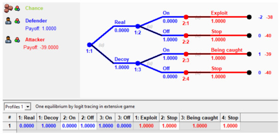 For the simulation, we focused on the game between the attacker and the defender; we used Gambit V15.1.1, which is a library of game theory software and tools for the analysis of finite extensive and strategic games [18], and MATLAB R2021b v9.11.0.