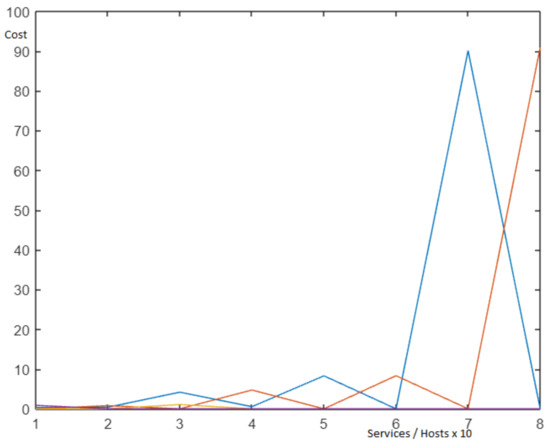 After applying the linprog function in Matlab for 1, 10, 50, and 100 service(s)/host(s) in our environment using the method described earlier, we calculated the payoff matrix. The Matlab simulation results presented in Figure 11 show that the costs for both players increased significantly with N increasing.