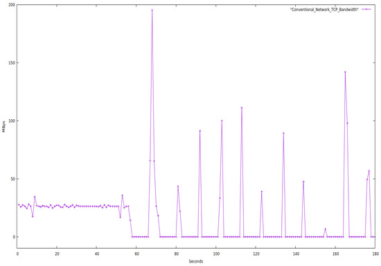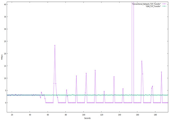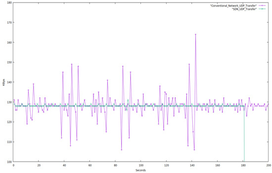 Figure 7 clearly shows that throughput nearly stays constant for a constant bandwidth in an SDN network. In contrast, there is so much fluctuation in a traditional network that the transfer rate occasionally drops to zero and stays there for a while. We also noticed that SDN could transfer more data than the conventional network for the same period.