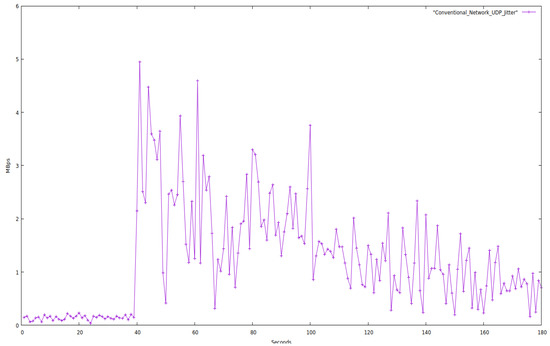 Both networks are evaluated for 180 s while restricting the bandwidth to 1.05 Mbps and solely using UDP protocol packets. The characteristics of the network are depicted in Figure 8, Figure 9, Figure 10 and Figure 11.