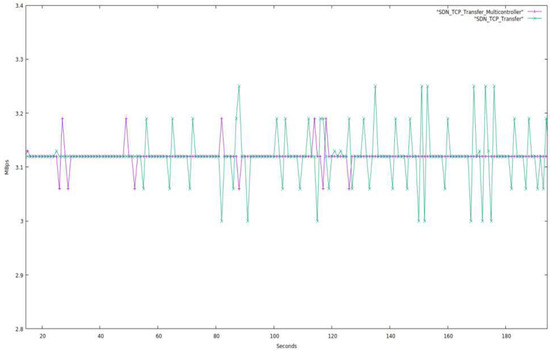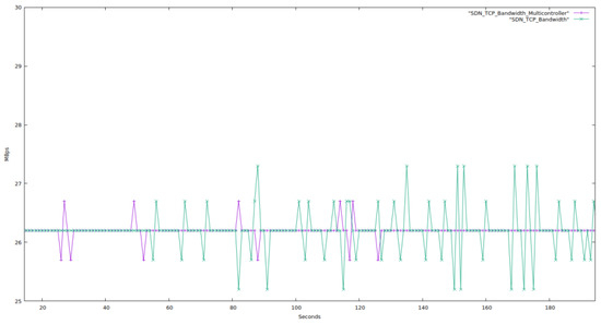In this part, we contrast a topology with just one SDN controller with one with several (in this case, three) SDN controllers. This topology has 34 network devices, including 23 computers, 8 OpenFlow switches, and 3 SDN controllers. The single-controller topology has 32 network devices in total, including 23 computers, 8 OpenFlow switches, and one SDN controller. We tested both networks for 180 s while setting the bandwidth to 26.2 Mbps and using TCP protocol packets. The network characteristics are displayed next in Figure 12, Figure 13, Figure 14, Figure 15 and Figure 16.