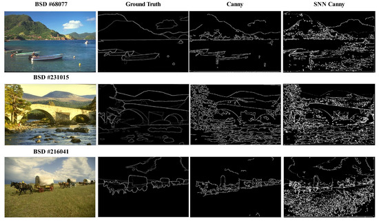 Figure 2 displays the original image (No. 61060) from BSD500 dataset [32,33] (license: Not found) and the intermediate output images of the spiking detector network after the Gaussian kernel, gradient calculation, non-maximum suppression, double-threshold filtering, and edge-tracking by hysteresis. The intermediate features show the spike domain implementation is effective in performing all five steps involved in the conventional Canny edge detection algorithm. The edge map resulting from the spike-based computation, i.e., the output of the network after the edge-tracking hysteresis step, can be referred to as the neuromorphic Canny edge detector or SNN-based Canny edge detector. We find that the resolution of the images from BSD500 dataset is sufficient to evaluate the qualitative and quantitative performance of edge detection. In Figure 3, we compare the neuromorphic Canny detector with the Sobel detector and the conventional Canny detector for a set of four images and their ground truth edges from the BSD500 dataset [32,33]. We find the neuromorphic Canny detector detects edges similarly to the edges generated by both the conventional detectors. The spike-based detection reported here results in relatively more highlighted edges in the objects while retaining some of the structural features that seem to have been lost in the conventional edge detectors. This can be attributed to the difference in the range of thresholds used in the spike domain implementation compared to the conventional Canny edge detector. With an implementation on a low size, weight and power (SWaP) hardware, for example, by emulating spikes on a field programmable gate array (FPGA) [34] or edge computing devices, such as NVIDIA Jetson TX2, together with a neuromorphic camera, the spike domain image processing algorithm will be attractive for new applications, for example, in handheld computer vision systems and for low-Earth satellite-based object detection.