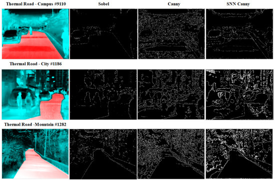 A comparison of edge detection by Sobel, Canny, and SNN Canny edge detectors for images from thermal road dataset.
