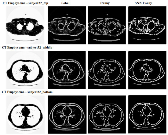 Biomedical image processing is a field with an increasing demand for advanced algorithms that automate and accelerate the process of segmentation. In a recent review, Wallner et al. reported multi-platofrm performance evaluation of open-source segmentation algorithms, including the Canny-edge-based segmentation method, for cranio-maxillofacial surgery [37]. In this context, it is desirable to test newer algorithms such as the one developed here using spiking neurons on medical images. To this end, we performed an edge detection experiment with a few representative medical images from the computed tomography (CT) emphysema dataset [38] (this database can be used free of charge for research and educational purposes). This dataset consists of 115 high-resolution CT slices as well as 168 square patches that are manually annotated in a subset of the slices. Figure 6 illustrates a comparison of the three edge detectors, Sobel, Canny and SNN-based Canny detectors, for a few example images from the CT emphysema dataset. Ground truth for edge maps is not available for this dataset to perform a quantitative comparison. A visual comparison of the edges generated from the three edge detectors, presented in Figure 6, shows that the SNN-based Canny edge detector is competitive with the other two edge detectors and offer an algorithmically neuromorphic alternative to the conventional Canny edge detector.