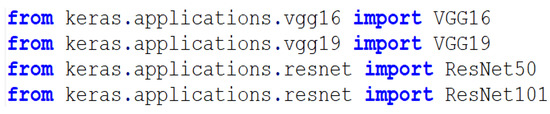 As mentioned, the Python programming language was the ideal candidate for the testing and implementation of our work. The PyCharm IDE worked quite well with both our datasets and our chosen CNN models; in addition, we also imported several different Python packages to help with our image classification. While we did tweak and enhance the various CNN models that were utilized for testing purposes, the initial CNN models were obtained via the Keras open-source software library. A visualization of the implementation of the base CNN models can be seen in Figure 1. It was decided that we should utilize Keras due to its built-in functionality for interfacing with various neural network architecture [29].