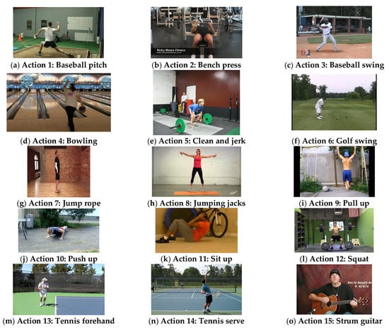 For the Penn Action videos, the action of guitar strumming was removed since the video frames only consisted of the upper half of the human body. The first 14 actions were used in this experiment (refer to Figure 2). Since the Penn Action dataset only provided 1 annotation of a keypoint of the head, which differed from the four HPE libraries (refer to Table 3), the head annotation was removed from the experiments to maintain a fair comparison among all libraries. Thus, the 12 remaining keypoints were used as the ground truth.