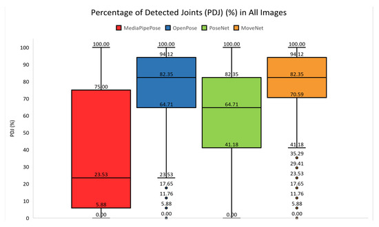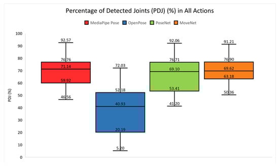 The mean PDJ for each action was calculated and the PDJ values for all actions are shown in Figure 4. Among three HPE libraries, MoveNet (orange box), MediaPipe Pose (red box), and PoseNet (green box) achieved slightly similar performances in terms of minimum, first quartile, median, maximum, and third quartile values. MediaPipe Pose (red box) had the highest PDJ in terms of maximum and median values, while MoveNet (orange box) scored the highest in terms of minimum, first, and third quartile values. OpenPose (blue box) portrayed a weak performance with the lowest values for all quartiles.