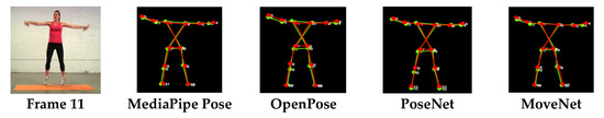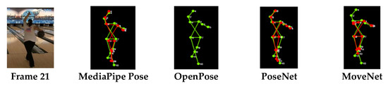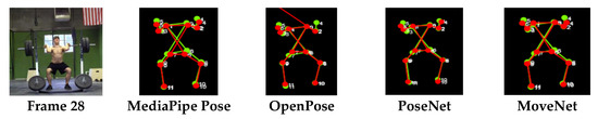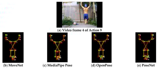 Since the results in Table 6 show that the four HPE libraries achieved the best performance in Action 8 (jumping jacks) among all actions, a closer analysis was performed. MediaPipe Pose, MoveNet, and PoseNet reached approximately 92% while OpenPose achieved approximately 72% for Action 8. Figure 5 shows the video frame and detection results of Action 8, where the two challenges, self-occlusion and inappropriate camera position, are absent. Hence, the performance of HPE should be better when there are less challenges affecting keypoint detection. On the other hand, the performance of HPE is reduced when there are more challenges. MediaPipe Pose showed the poorest performance in Action 12 (squat); OpenPose and PoseNet showed the worst performance in Action 2 (bench press); while MoveNet showed the poorest performance in Action 4 (bowling). Figure 6, Figure 7 and Figure 8 show the sample video frames and detection results of each HPE library for Actions 12, 2, and 4, respectively.