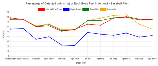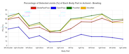 In addition, the PDJ values for each body part in each action were also calculated. Frequent changes in keypoint positions also affects the performance of keypoint detection. In Actions 1, 3, 4, 6, 13, and 14, the PDJ values for elbows and wrists in all the tested libraries were lower than those of other body parts, as shown in Figure 9, Figure 10 and Figure 11. This was due to frequent changes in keypoint positions in the elbows and wrists compared to other body parts. For instance, the person who plays bowling only needs to use his elbow and wrist to release the ball to the bowling lane, hence showing fewer changes of movement in other body parts. Likewise, the performance of OpenPose (blue line) showed the lowest PDJ among these actions, while the fluctuations in PDJ values between other HPE libraries were relatively small.