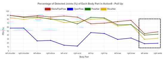 When the common challenges (self-occlusion and inappropriate camera position) occurred in the videos, the performance of keypoint detection was affected in all HPE libraries. Figure 12 shows the video frames of Action 9 (pull up), showing the self-occlusion effect in the action. In this action, all libraries showed much lower performance in some of the body parts compared to that of other body parts due to this self-occlusion effect. The corresponding PDJ values are reported in Figure 13. The PDJ values for ankles (black dotted box) were much lower than other parts because of self-occlusion from the crossed ankles, as shown in Figure 14. OpenPose (blue line) achieved the lowest performance for all body parts, particularly for elbows and wrists. Additionally, the performance of MoveNet for the ankles was lower than that of MediaPipe Pose and PoseNet when facing the self-occlusion effect.