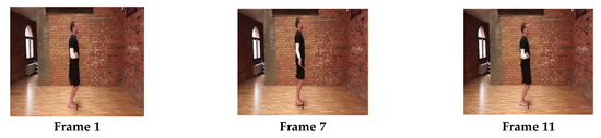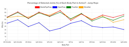 In addition, inappropriate camera position is one of the common challenges for human pose estimation. In Action 7 (jump rope), the camera was placed on the right side of the person and the video frames were recorded from the right side, as shown in Figure 15. Hence, self-occlusion occurred to the left body parts, which reduced the performance of keypoint detection for the left body parts. Figure 16 clearly shows that the performance of all HPE libraries for the right body parts was higher than that for the left body parts, where the PDJ values for the right shoulder and right elbow were always higher than those for the left shoulder and left elbow.