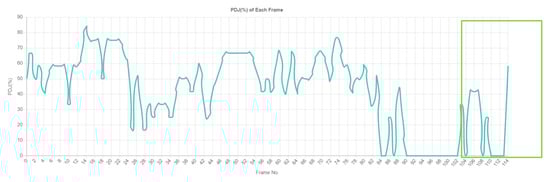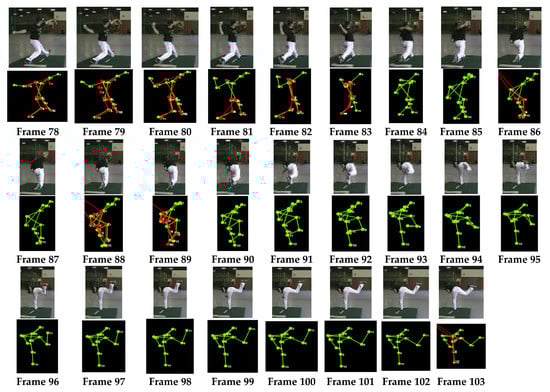 The performance of HPE libraries is reduced when they are constrained by challenges such as inappropriate camera position and the self-occlusion effect. OpenPose was the least robust in detecting video frames when facing these challenges. This is because OpenPose always loses track when self-occlusion occurs in the video frames. Figure 17 illustrates this point in the line graph of PDJ values for OpenPose in each frame in Action 1 (baseball pitch). Based on the results, the PDJ values decreased from frame 84 to 102 (refer to the green box). Due to the bottom-up method used by OpenPose, the detected keypoints cannot be grouped into a human instance when there is self-occlusion in these frames, resulting in tracking failure. The original video frames and results of the OpenPose detection from frame 78 to 103 are shown in Figure 18 for illustration. OpenPose obviously performed poorly in frames with self-occlusion (frames 84 to 103).