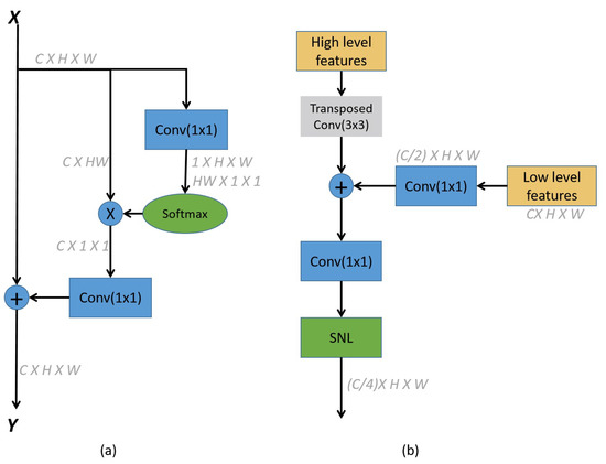 The standard Non-local (NL) [30] is responsible for reinforcing the features of the query location by assembling features from other locations. The SNL [12] block is the simplified version of NL, which aims to compute a global attention map and shares this attention map for all query positions. SNL has a lower computation cost than and similar performance to NL. In Figure 2a, the detailed structure of the SNL block is illustrated. We denote as a feature map whose height is H and width is W. and represent the input and output of the SNL, respectively. The process of SNL block can be formulated as follows: