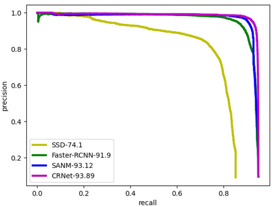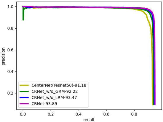 Table 1 presents the ablation experiment’s outcomes. We can see that our GRM and LRM can each outperform the baseline model in terms of AP by 2.29% and 1.04%, respectively. On the Brainwash test dataset, using LRM and GRM simultaneously can even improve performance by 2.71% over the benchmark model. Figure 4 displays the precision recall (PR) curves of the ablation analysis of CRNet at IoU 0.5 on the Brainwash dataset. These results show that LRM and GRM can effectively improve the performance of the head detector.