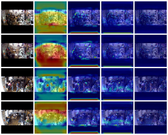 Furthermore, we display qualitative results of GRM on the Brainwash test set. We exploit Grad-CAM [40] to visualize the class activation map (CAM) [41] for SNL blocks from different GRMs in Figure 5. Input images and the CAMs of the , , , and are displayed in order from left to right. The CAM will highlight the area that has more influence on the result. The greater the contribution of the area to the final result, the more the area will be highlighted. It can be clearly seen that the process of the global context of images is refined step by step. In Figure 5, from left to right, almost all head center points become clearer and more accurate. The ability of GRM to obtain the global context and gradually refine the global context by combining features from various resolutions is demonstrated by this process. It can be determined from the last row in the figure that even the completely occluded head (left bottom) can be recalled through the refined global context, which is nearly impossible using the local context.