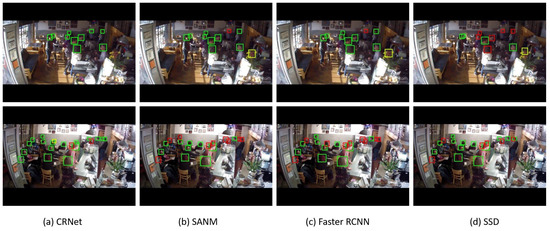 According to the ablation studies above, we adopt GRM on the outputs of all stages and a multi-scale dilated convolution with dilatation rates of . Finally, we evaluate the performance of our detector against several other representative detectors, including SSD, Faster-RCNN, TINY [42], and the existing methods for head detection, such as HeadNet [13] and SANM [32]. Table 4 offers a summary of the results from the Brainwash dataset. We provide some examples in Figure 6. These examples indicate that our model has good performance in densely populated scenes and small target detection. Figure 7 compares CRNet with other head detectors that show good performance by plotting the PR curves at IoU 0.5 on the Brainwash dataset. Our method shows a better performance than other detectors, which proves the superiority of our proposed model. A competitive performance is obtained when we test our model on HollywoodHeads as well. In Table 5, the outcomes for HollywoodHeads are presented. Figure 8 presents the qualitative results of our method on the HollywoodHeads dataset.