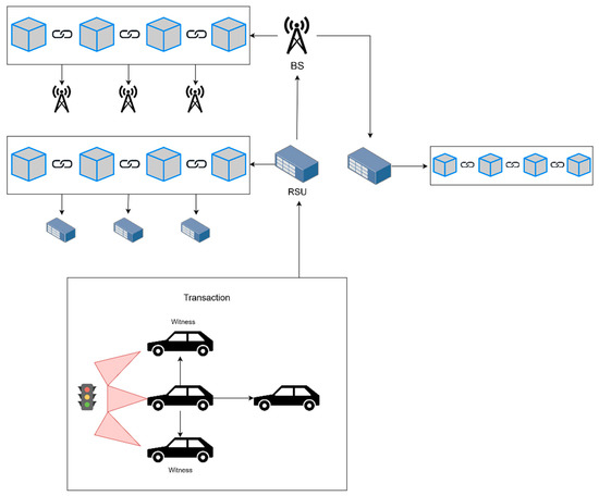 On the local tier, neighboring vehicles are grouped as a cluster to be a blockchain subnetwork. Vehicles use their local sensors to make observations and predictions about their environment and broadcast this data to other vehicles within their cluster. Witness vehicles exist that can confirm or deny the vehicle’s broadcasted data using their own local sensors and, subsequently, ascribe a reputation score—0 to denote a noncredible transaction and 1 to denote a credible one—to the given communication. All witness vehicles contribute a reputation score to the broadcasted communication, impacting its credibility by skewing its averaged reputation score, which is a floating-point number between 0 and 1. The sender and witness vehicles all sign the transaction with their private key, which is packaged along with the transaction contents into a block by the RSU.