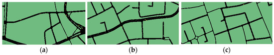 Gueriau and Dusparic’s traffic simulator in the Eclipse Simulation of Urban MObility (SUMO) [52] was used to inform the frequency of transactions used in the model presented in Section 5. At 1000 s intervals, 25 frames were captured from three different regions, each covering 0.44 km × 0.19 km. Figure 2 shows the three regions from which frames were captured, and a single frame is presented in Figure 3. Then, vehicles within proximity (25 m) of each other’s communications were recorded in Table 2 to determine which vehicles could witness each other’s transactions. At least one transaction occurred in 86.7% of frames, with 59.2% of vehicles in a frame participating in a transaction on average. Within the simulation, presented in subsequent subsections, these values can be used to inform the probability for a turn to include a transaction, as well as the number of recipients for each transaction. While data pertaining to traffic in Dublin was used herein, alternative simulators could be used to model traffic in other locations with varying levels of traffic congestion and AV density.