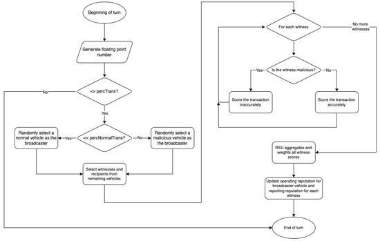 The model runs for a given number of turns, which represents the time component of the simulation. Figure 4 illustrates the lifecycle of a turn. For each turn, a randomly generated floating point value is used to stochastically determine if a maneuver-event or sensing-based report will occur. Once this first determination is made as to whether such an event will occur or not during the turn, subsequent determinations are made, regarding what type of vehicle initiated the event. The recipients of the transaction are randomly selected from the remaining vehicles; the number of recipients is constrained by fixed lower and upper bounds. A proportion of these recipients are randomly chosen as witnesses to validate the transaction. Along with this, an RSU is selected to store the transaction and witness scores.