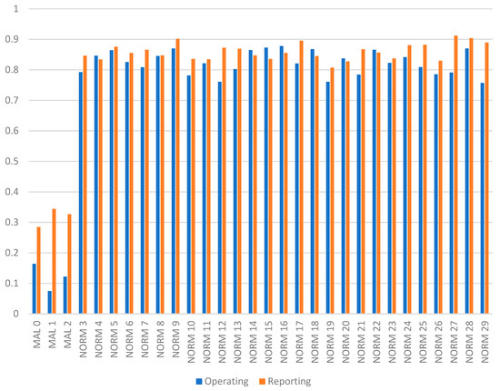 The results demonstrate the efficacy of the system. The three malicious vehicles all received significantly lower operating and reporting scores than the normal vehicles. These results are depicted in Figure 5, which shows the average operating and reporting scores that were generated from running the base model 1000 times for 5000 turns with 30 vehicles. Notably, the operating score for the malicious vehicles was much lower than the reporting score. This is likely due to the fact that the methods for calculating operating reputation are more punitive against non-credible transactions. With an average operating error of 0.175 and reporting error of 0.160, the data indicates that the simulation was able to effectively distinguish malicious vehicles from normal ones.