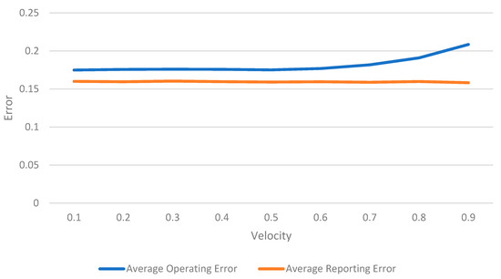 Focus now turns to analyzing the impact of system parameters. First, the impact of velocity is assessed. Figure 6 shows that error remains relatively steady for velocities from 0.1 to 0.7, but operating error exhibits a noticeable increase once velocity goes beyond 0.7. For vehicles whose most recent transactions were rated poorly, a high velocity will adversely affect their reputation. The inverse applies as well, with high velocities having the potential to greatly increase a vehicle’s reputation if its last transactions were rated positively. As a result, an increased velocity creates higher variability in the reputation of vehicles since it is more dependent on the most recent transactions, regardless of the vehicle’s prior history.