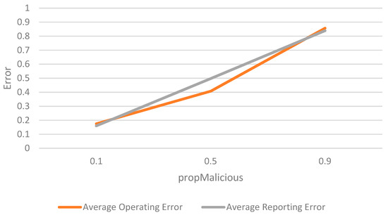 Next, the impact of considering witness reputation was explored. Figure 9 shows the results of the simulation being run with the reputation of witnesses factoring into the overall score of each transaction. Under this approach, witnesses with lower reputations had a reduced impact on the transactions they scored, while witnesses with higher reputations had a greater impact. When implementing this weighting method, there was a noticeable decrease in both operating and reporting error in the simulation. This highlights the value of reducing the effect that lower reputation vehicles have on the network by proactively devaluing their input. Furthermore, once the reputation of malicious vehicles decreases, they no longer possess the same effect on the reputations of other vehicles.
