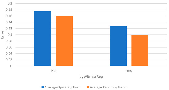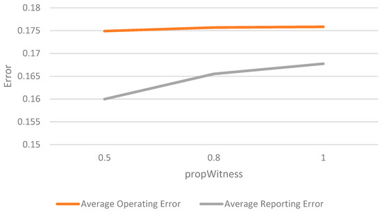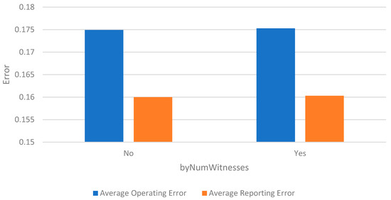 Focus now turns to the impact of considering the number of witnesses in ratings. Figure 10 shows the results of the simulation being run with and without the byNumWitnesses parameter. This parameter, when true, weights the transactions, in averaging, based on their number of witnesses. In the context of the simulation, this causes transactions with a larger number of witnesses to have a greater effect on the operating and reporting reputations of the participating vehicles. For example, a transaction that was rated poorly by a large number of vehicles will have a comparatively greater effect on the broadcasting vehicle’s reputation than a poorly rated transaction with fewer witnesses. Weighting transactions by the number of witnesses produced a negligible change in operating and reporting error. It was hypothesized that enabling the parameter would result in a decrease in operating and reporting error, since transactions with more witnesses should, theoretically, hold more credibility; however, this was not the case. This is likely due to the stochastic nature of the simulation, in which transactions with a low number of witnesses are invariably balanced out by transactions with an equally high number of witnesses. Furthermore, there may not have been enough variability in the number of witnesses for transactions, as each transaction ranged from having 10 to 20 witnesses, which may not have produced as significant of an effect as might be possible with other values. However, these are realistic settings for many regions.