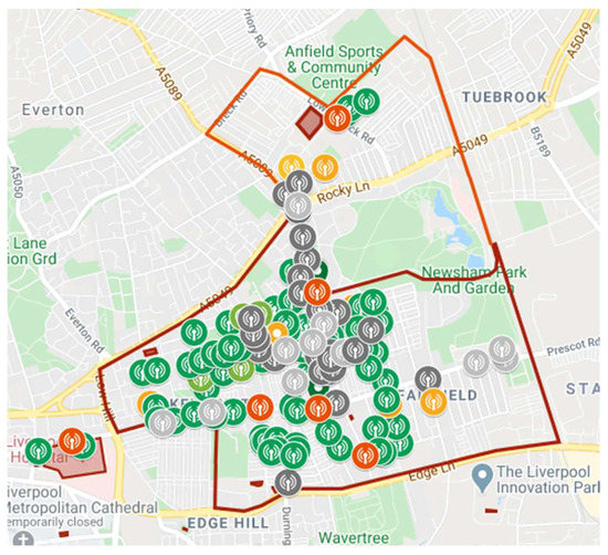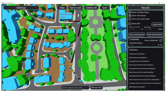 We consider a case study to simulate the deployment of the backhaul network on Sheil Road in Liverpool, by the Fairfield Medical Centre. This deployment was developed based on a 5G network planning tool, which provides an online copy of Kensington in Liverpool, for the Liverpool 5G network (https://www.cgasimulation.com/network-planning-tool/, last accessed: 15 December 2021). From this tool, we were able to build a simulated deployment of nodes and model their performance in an urban environment [32]. Figure 3 illustrates the Fairfield Medical Centre modelled by the planning tool. Moreover, the tool provides information for each of the nodes in the network, such as the site of the node, the kind of installation, the direction, the latitude and the longitude, which we used to build our simulation.