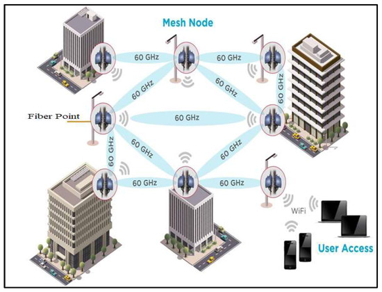 Zhen Gao et al. in [12] stated that mmWave is suitable for backhaul links in ultra-dense wireless networks due to several unique properties: having a high capacity, being inexpensive and small form factor equipment, and having an immunity to interference. More recently, research has been conducted on the use of this technology to support densely meshed wireless backhauls as shown in Figure 2. The work in [13] studied the performance of a mmWave meshed backhaul deployment in a district of Barcelona. The links between nodes in the network were based on IEEE 802.11ad technology at 60 GHz. The work demonstrated the viability of the technology over multiple hops and showed the influence the number of gateways (POPs) and the number of radio channels available has on performance.